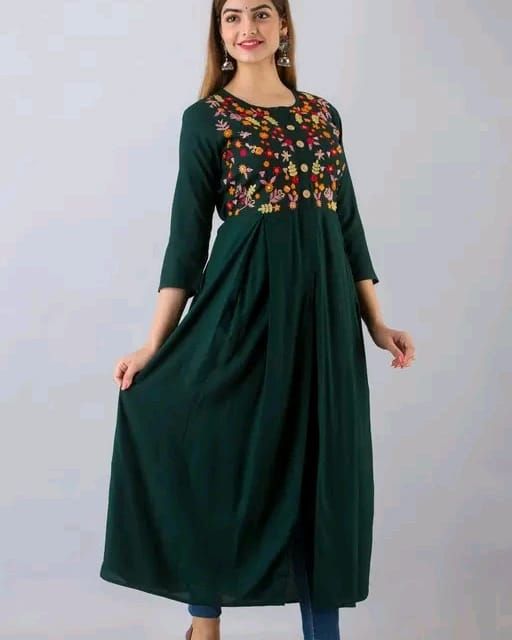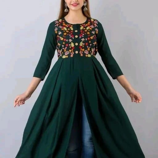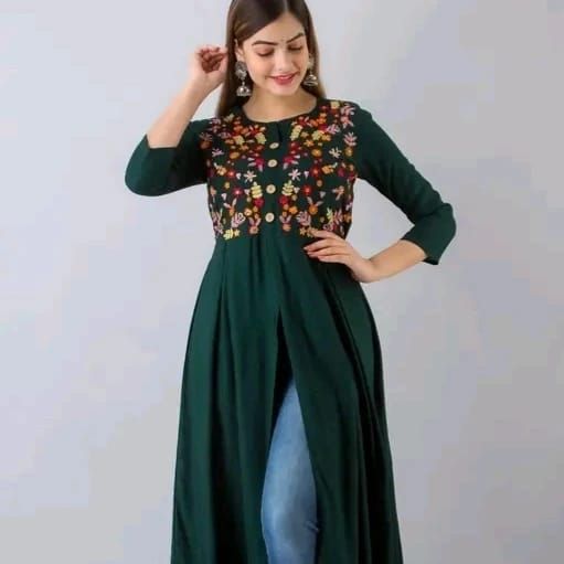 Attributes : Brand: Unspecified, Fit/Shape: High-Low, Sleeve Length: Three-Quarter Sleeves, Sleeve Styling: Regular, Pattern: Embroidered, Combo of: Single, Length: 46 inches, Stitch Type: Ready to wear, Occasion: Casual, Special events, Neck: Round, Color: Dark Green, Fabric: Rayon, Print or Pattern Type: Solid with Embroidery Ornamentation.